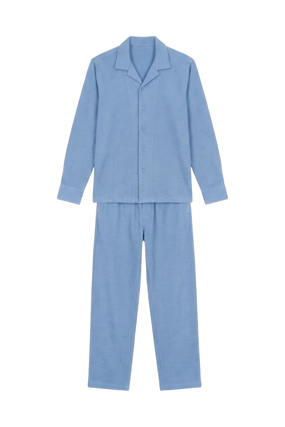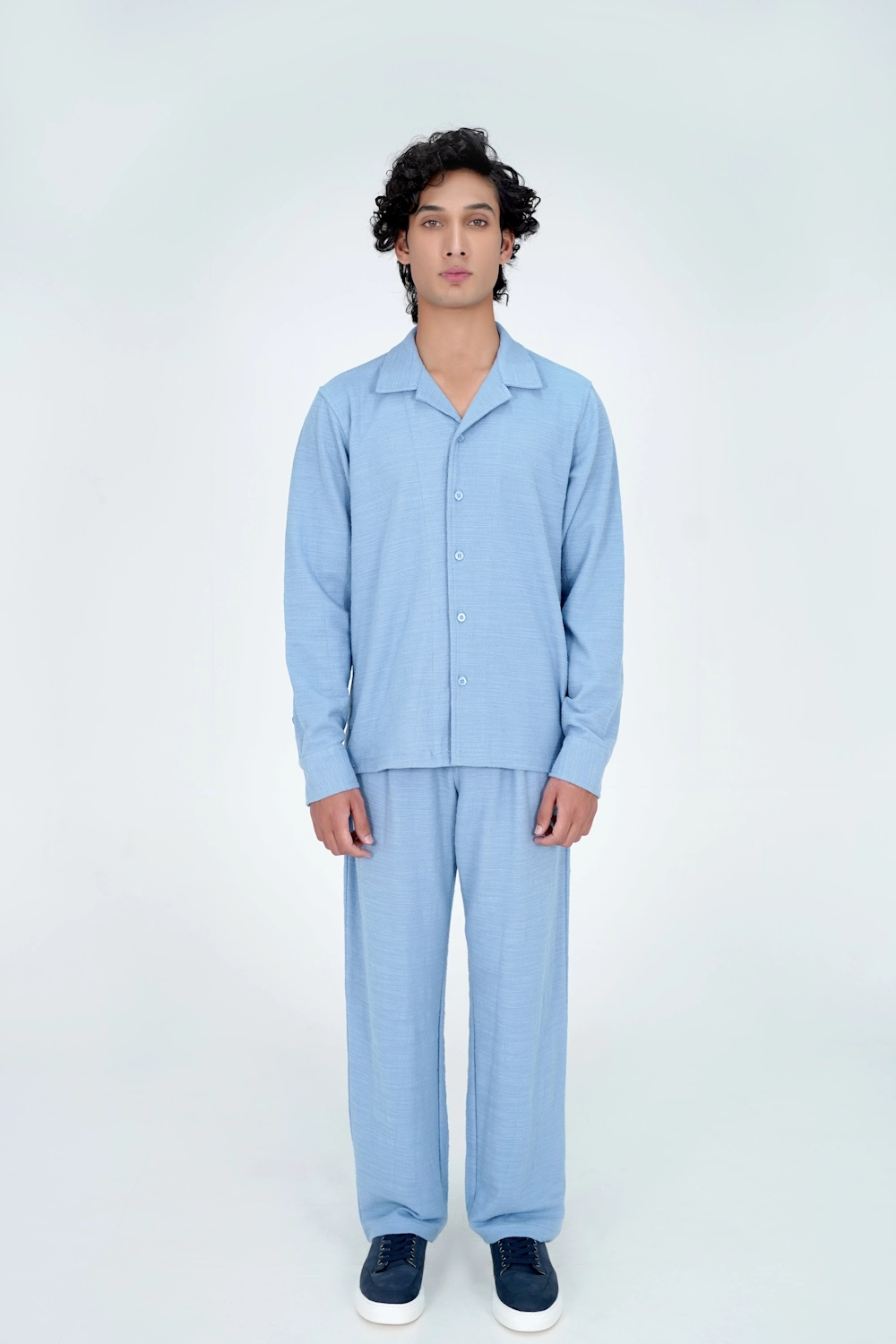 Matching shirt and trouser set in slub jersey fabric. Camp collar shirt with full button placket, paired with elastic waist straight leg trousers.