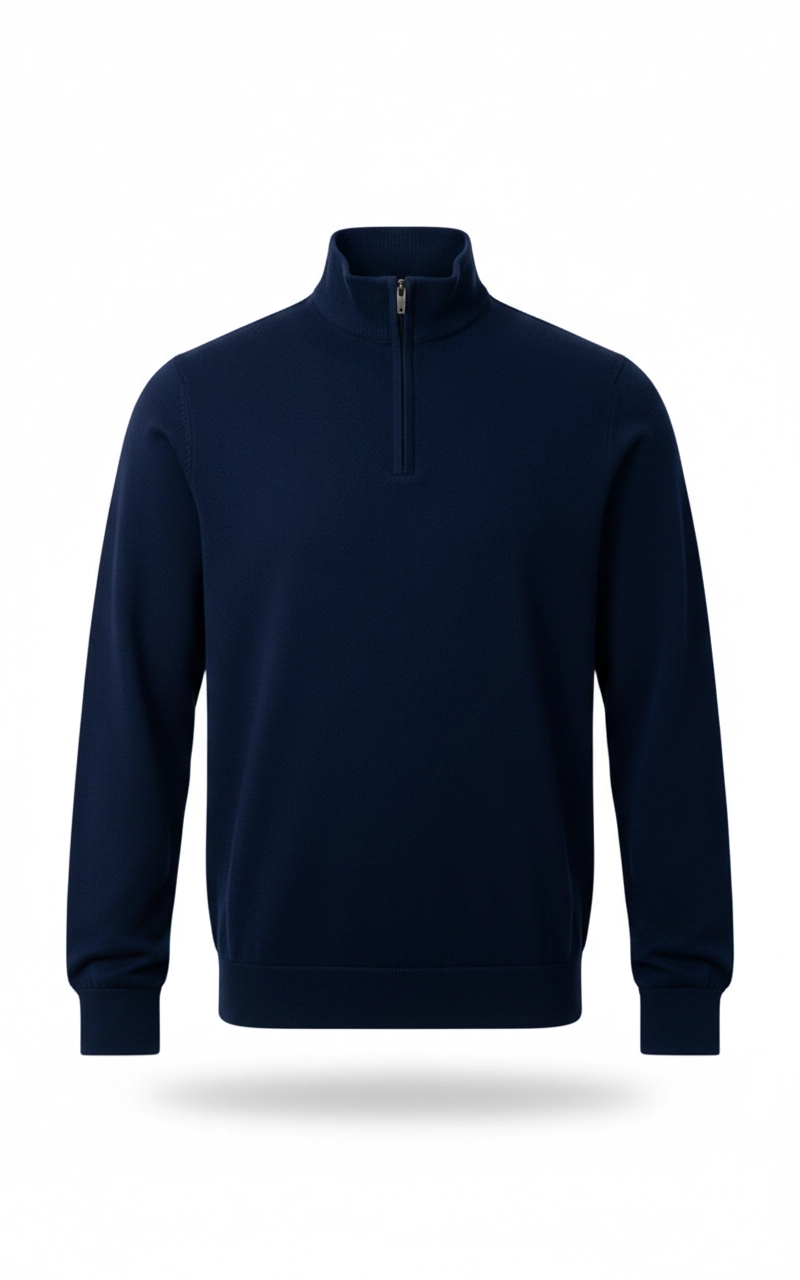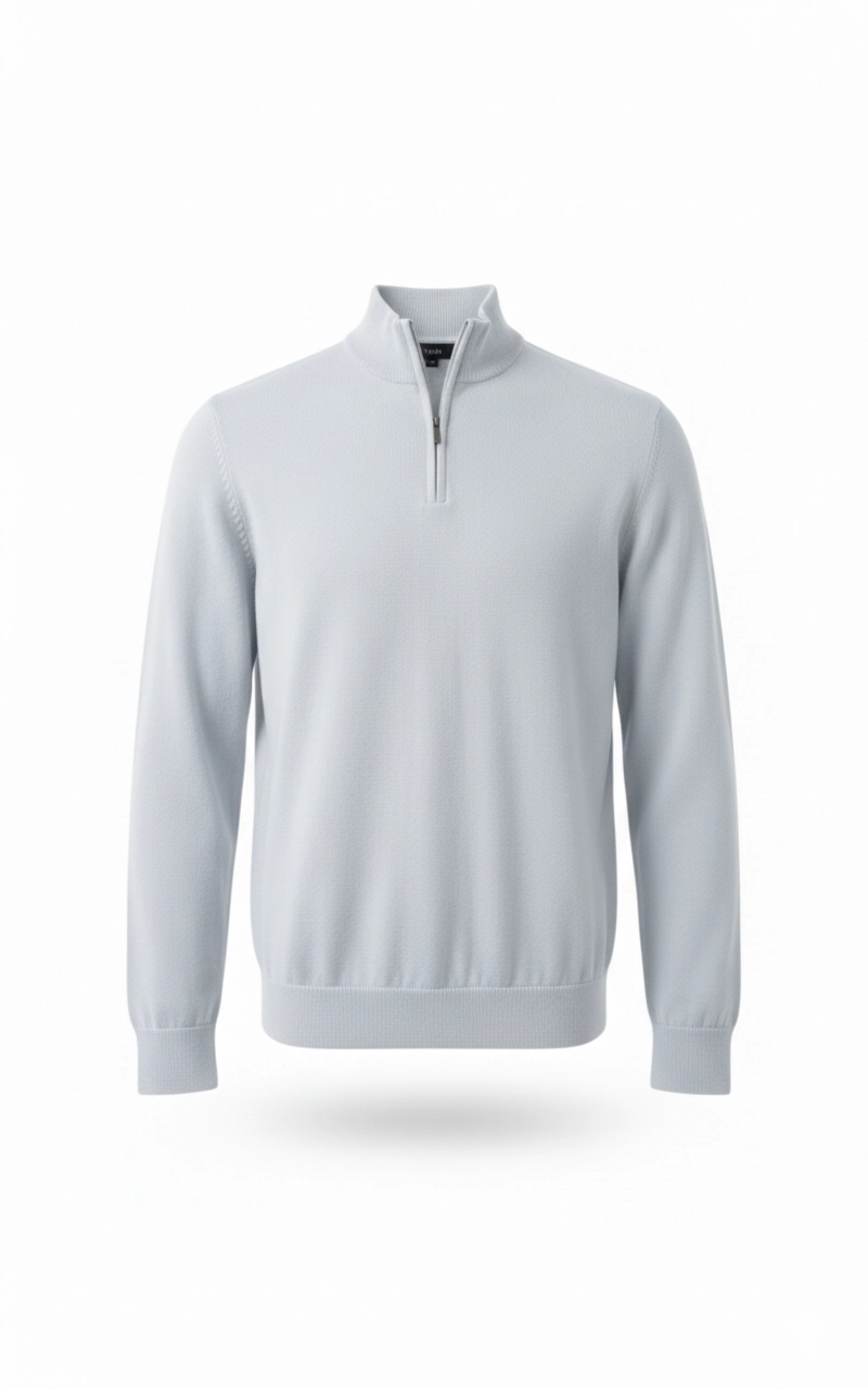 Stand Collar — Rises to frame the neck when zipped, lies flat and clean when open, adds the structure that elevates sweatshirt to sweater territory