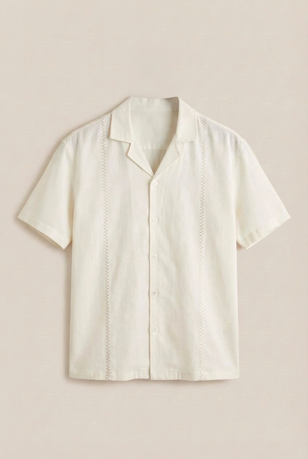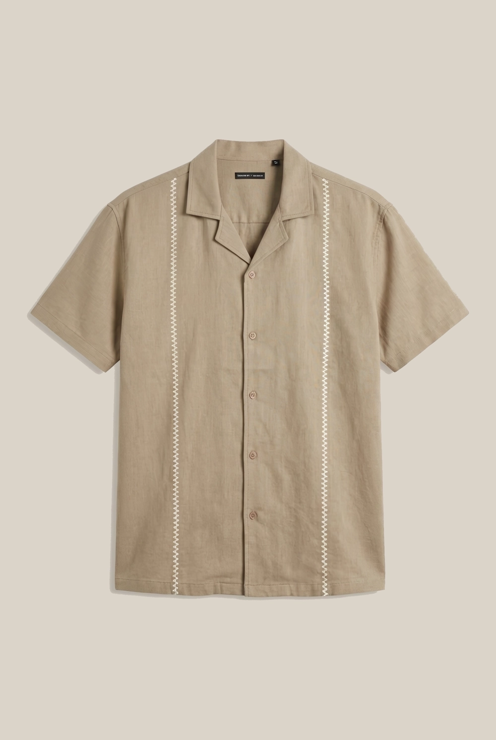 Camp collar shirt with decorative zigzag stitching. Artisanal detail for distinctive character.