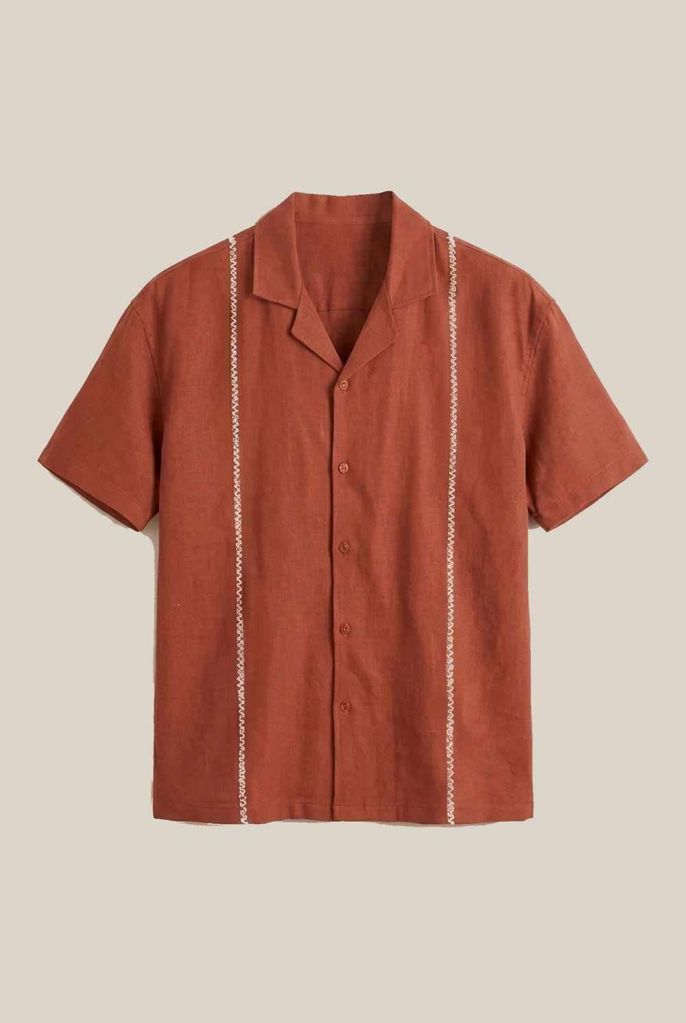 Camp Collar Short-Sleeve Shirt with Zigzag Embroidery Detail