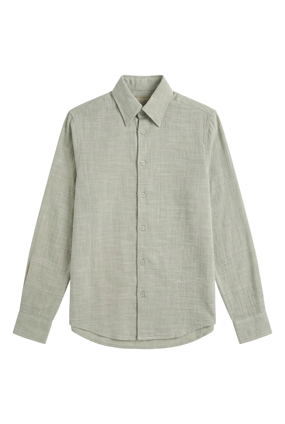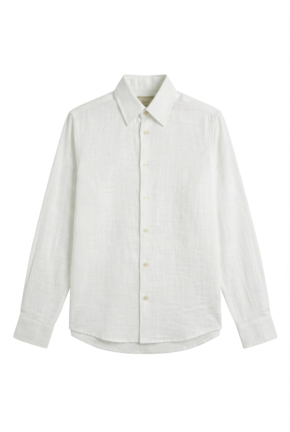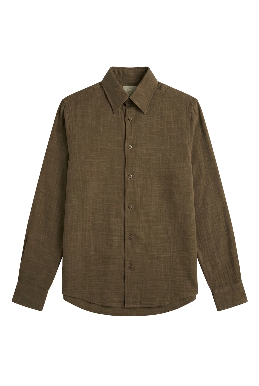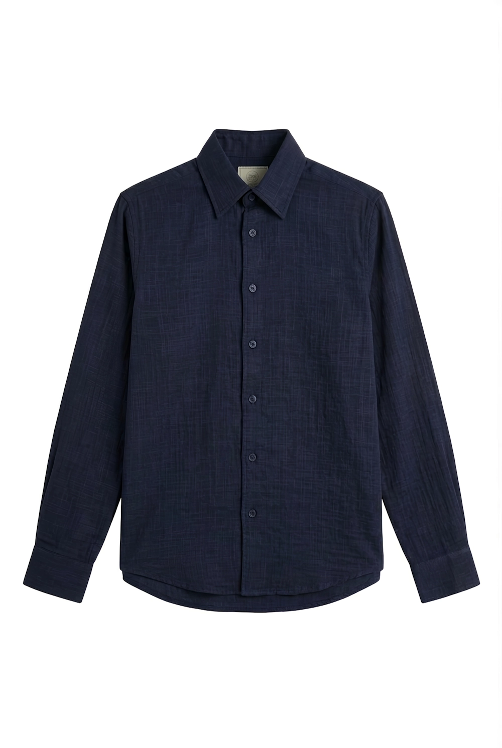 Natural slub-textured casual shirt. Organic fabric variation creates unique visual depth.