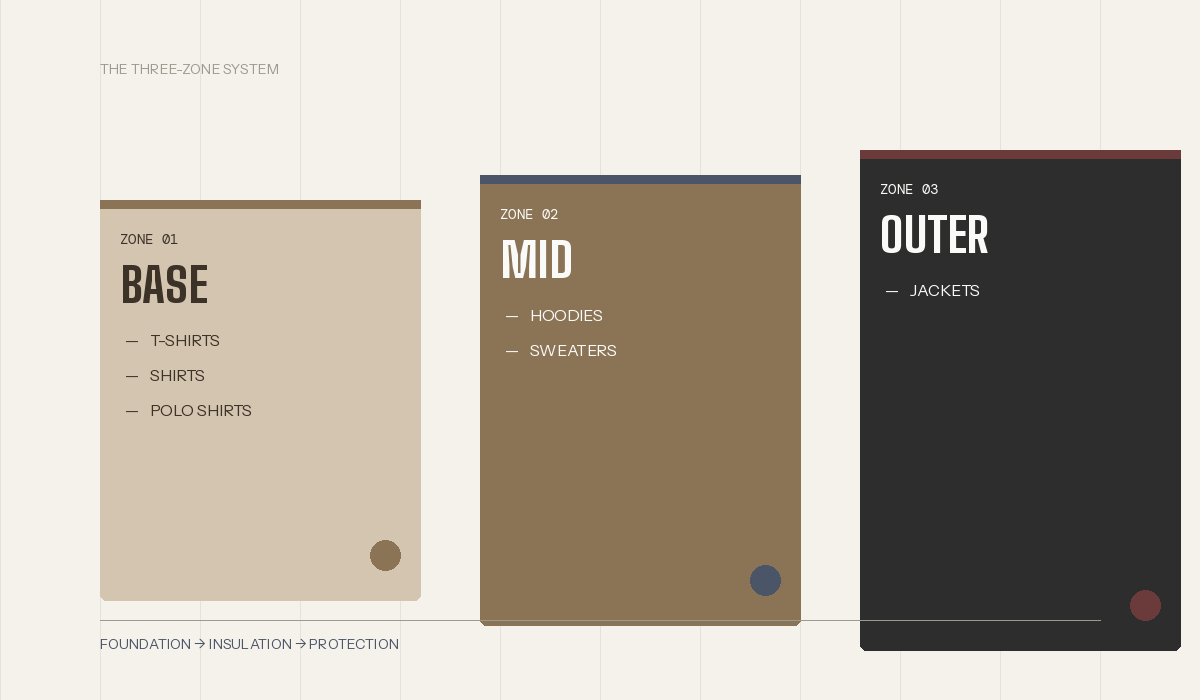 Professional layering operates on a three-zone system. Master this, and you’ll never second-guess an outfit again.